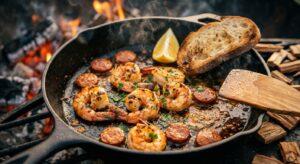 Le crépitement des flammes, l’odeur du chorizo qui commence à libérer son huile parfumée au paprika, et ces crevettes qui rosissent doucement au-dessus des braises…